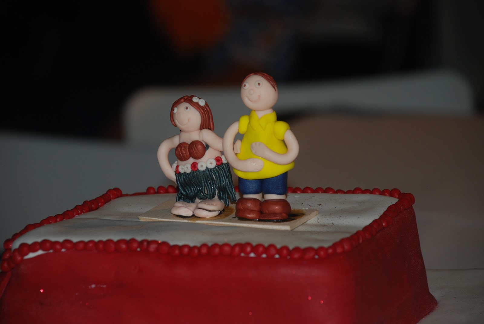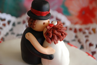 Fiquei de fazer também os noivinhos em fimo e só posso dizer que correu muito mal! No forno os bonecos partiram-se e depois de colados (porque apesar de ter tentado começar uns novos às 5.30 da manhã, reparei que não tinha mais cor de pele!!! baaaaah) voltaram-se a partir durante a viagem de carro. Portanto passei o dia a tentar reanimá-los (nem imaginam o cheiro da super cola que me trouxeram do chinês).